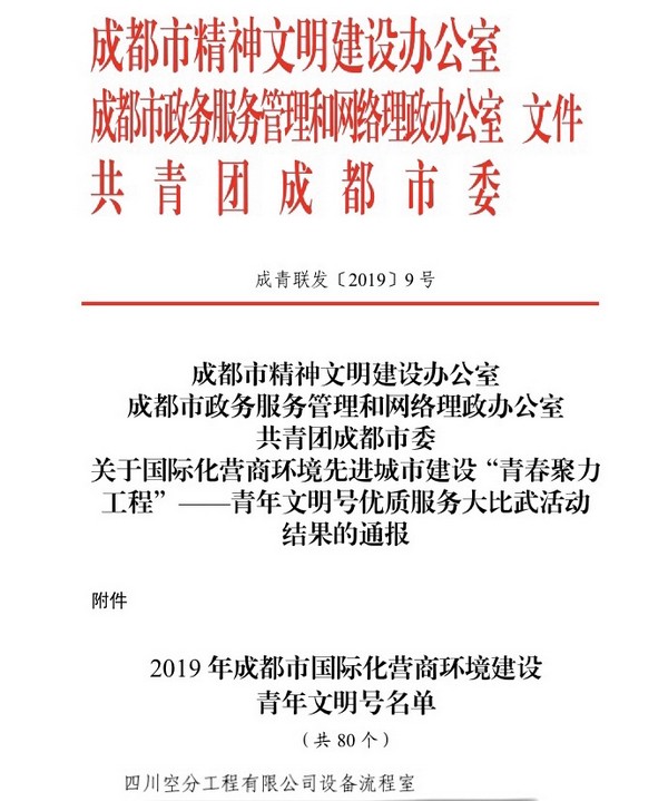 公司团委推报的四川空分集团工程有限公司设备流程室青年文明号响应活动号召,结合自身实际积极开展创建的各项活动。自2018年8月开始,经过预赛推报的层层考核,成功进入复赛。2019年6月25日同所有参加单位一起现场逐一进行了复赛答辩评审。此后,参与了为期15天的网上投票,得到了公司领导及广大员工的全力支持。最终经过组委会的综合评分等环节,四川空分集团工程公司设备流程室青年文明号在众多参选集体中脱颖而出成功进入最终获奖名单。