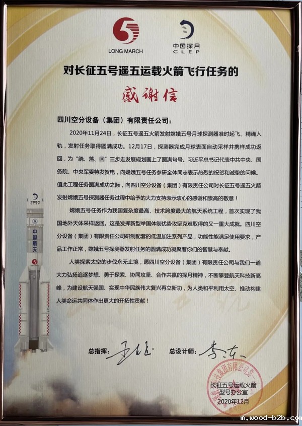 近日,我公司收到中国航天科技集团有限公司第一研究院长征五号运载火箭型号办公室发来的感谢信,对我公司在长征五号遥五运载火箭飞行任务中做出的贡献表示感谢! 2020年11月24日,长征五号遥五火箭发射嫦娥五号月球探测器准时起飞、精确入轨,发射任务取得圆满成功,受到中共中央、国务院、中央军委的贺电表彰。我公司也为发射任务的圆满成功做出了积极贡献。对此,中国航天科技集团有限公司第一研究院长征五号运载火箭型号办公室特向我公司发来感谢信,向我公司对长五发射过程中给予的大力支持表示衷心的感谢和崇高的敬意。