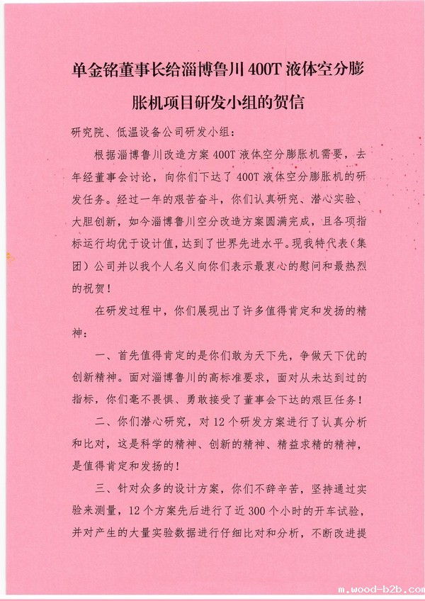 根据淄博鲁川改造方案400T液体空分膨胀机需要,去年经董事会讨论,向你们下达了400T液体空分膨胀机的研发任务。经过一年的艰苦奋斗,你们认真研究、潜心实验、大胆创新,如今淄博鲁川空分改造方案圆满完成,且各项指标运行均优于设计值,达到了世界先进水平。现我特代表(集团)公司并以我个人名义向你们表示最衷心的慰问和最热烈的祝贺!