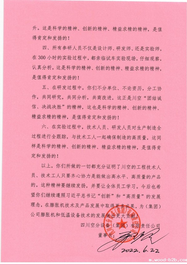 以上,你们所做的一切都充分证明了川空的工程技术人员、技术工人只要齐心协力是能做出高水平、高质量的产品的。这种精神要继续发扬,并要让全体员工学习。今后也希望你们继续遵照习近平总书记“创新”和“高质量”的发展理念,在膨胀机技术及产品发展中取得更多成果,为(集团)公司膨胀机和低温设备技术的发展做出更大贡献!