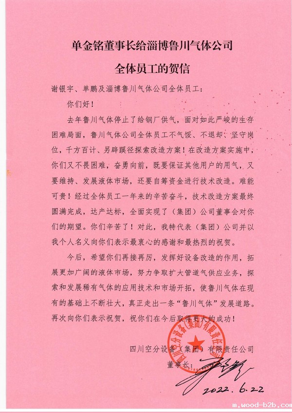 去年鲁川气体停止了给钢厂供气,面对如此严峻的生存困难局面,鲁川气体公司全体员工不气馁、不退却、坚守岗位,千方百计、另辟蹊径探索改造方案!在改造方案实施中,你们又不畏困难,奋勇向前,既要保证其他用户的用气,又要维持、发展液体市场,还要自筹资金进行技术改造。难能可贵!经过全体员工一年来的辛苦奋斗,技术改造方案最终圆满完成,达产达标,全面实现了(集团)公司董事会对你们的期望。你们辛苦了!对此,我特代表(集团)公司并以我个人名义向你们表示最衷心的感谢和最热烈的祝贺。