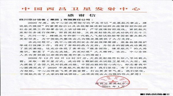 西昌卫星发射中心给我公司发来感谢信——对我公司在中国航天事业发展中的贡献表示感谢