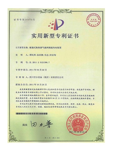 实用新型专利证书-板翅式换热器气液两相流均布装置