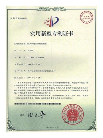 实用新型专利证书-卧式板翅式冷凝蒸发器
