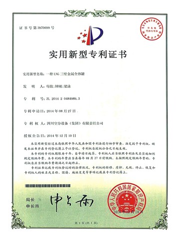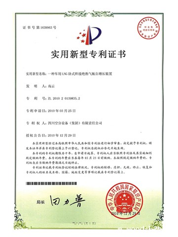 实用新型专利证书-一种车用LNG卧式焊接绝热气瓶自增压装置