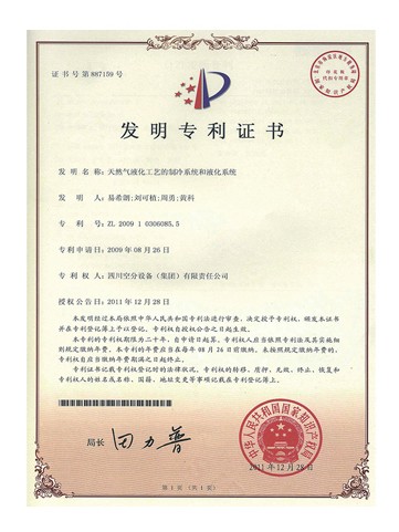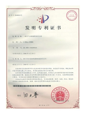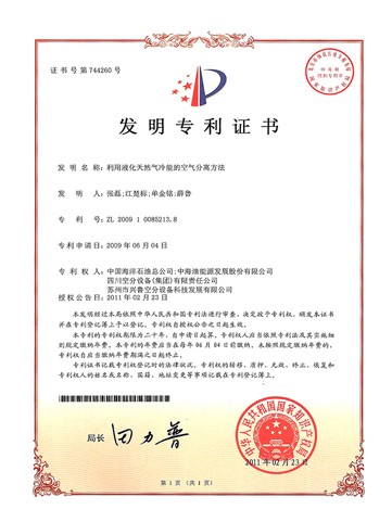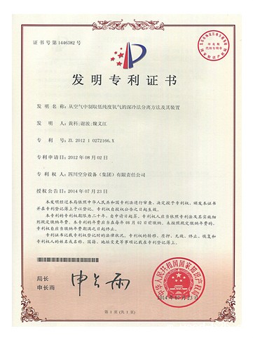 发明专利证书-从空气中制取低纯度氧气的深冷法分离方法及其装置