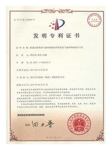 发明专利证书-板翅式换热器气液两相流均布装置及气液两相流混合方法