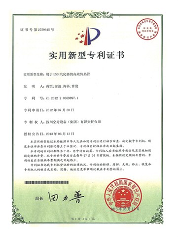 实用新型专利证书-用于LNG汽化器的高效传热管