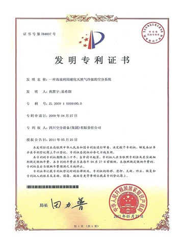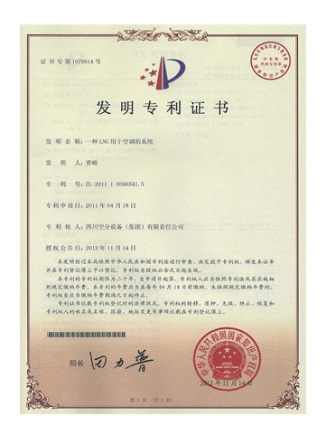发明专利证书-一种高效利用液化天然气冷能的空分系统